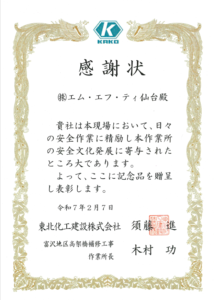 東北化工建設株式会社 様より感謝状と記念品をいただきました。